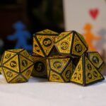 A set of seven acrylic fancy yellow dice with digits. One item is a bundle of seven dice.