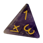 A single Amethyst gemstone dice. Hand-engraved digits and made out of real Amethyst crystal.